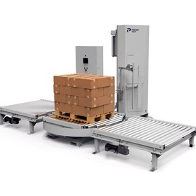 An automatic pallet wrapper carries pallets to the wrap zone with a conveyor. After wrapping the pallet, it sends it to the end of the packaging line via an exit conveyor.