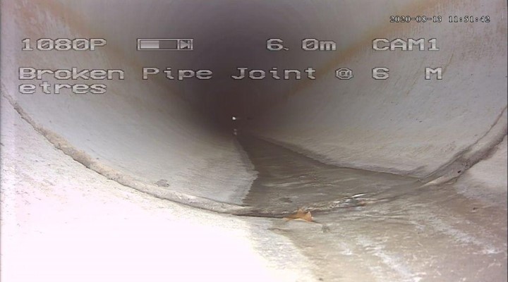 As the camera moved along the 600mm pipe, it became clear that the road surface displacement was caused by a large crack in the pipe’s structure. The crack had widened significantly over time, allowing water to escape and exert pressure on the surrounding soil, causing the road surface to buckle. Additionally, the team discovered signs of partial blockage in certain sections of the pipe, likely exacerbating the issue by restricting water flow and increasing internal pressure.
